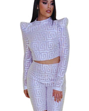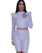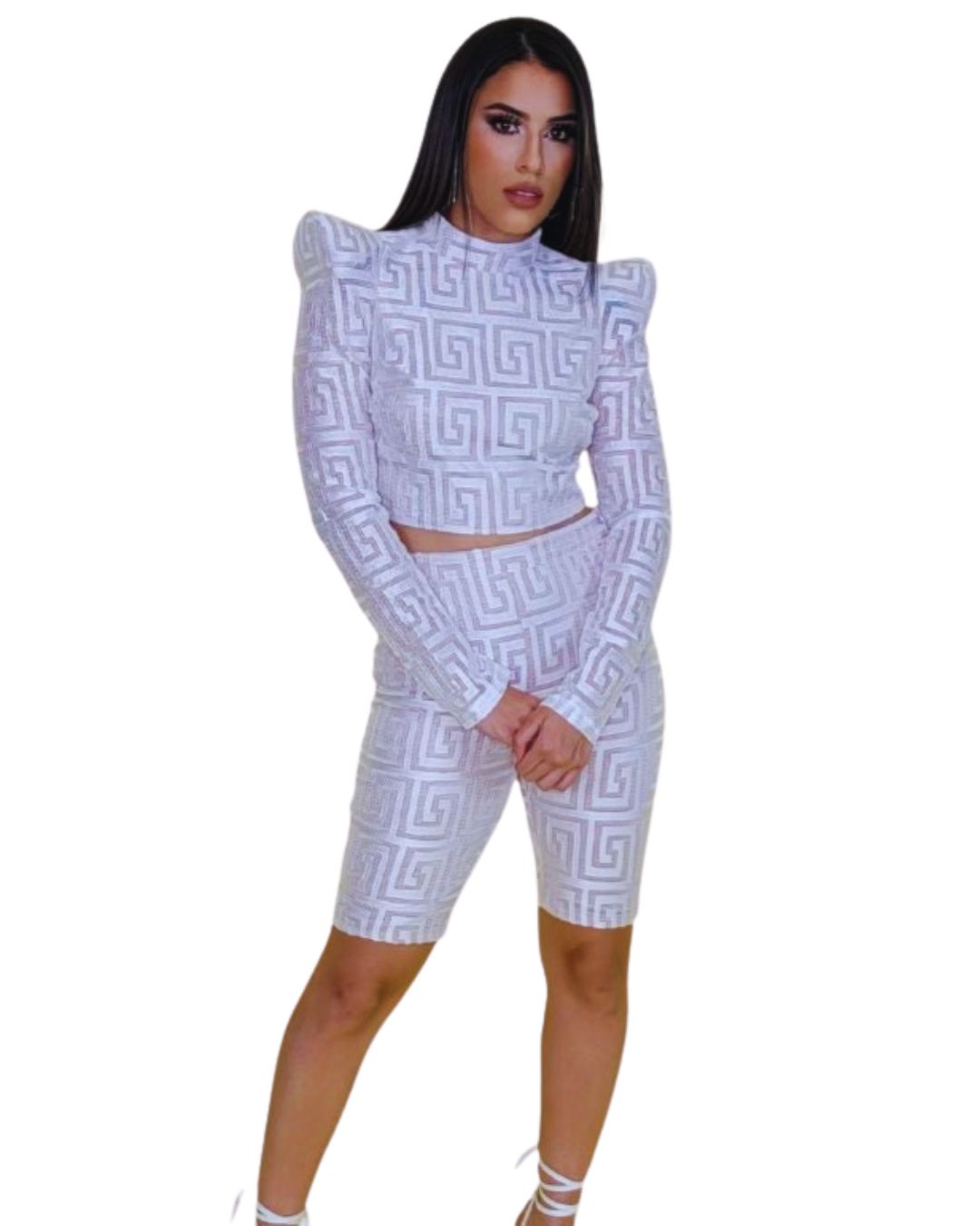 Conquista con seguridad y elegancia con el Conjunto Kavala de Top con Hombros Estructurados y Biker Shorts. Este set de dos piezas fusiona la sofisticación de un estampado griego con una silueta moderna que realza tu figura. El crop top de manga larga y hombros marcados aporta fuerza al look, mientras que los biker shorts de talle alto abrazan tu cuerpo para un ajuste favorecedor. Disponible en blanco y negro, es una opción poderosa para eventos, salidas nocturnas o simplemente destacar en tu día a día.