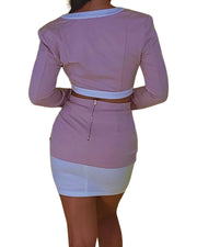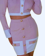 Compuesto por una chaqueta corta estructurada y una falda de corte ajustado, este conjunto realza la silueta con cortes limpios y detalles refinados. Su acabado con botones dorados aporta un aire atemporal, ideal para transitar con gracia de una ocasión formal a un evento especial.