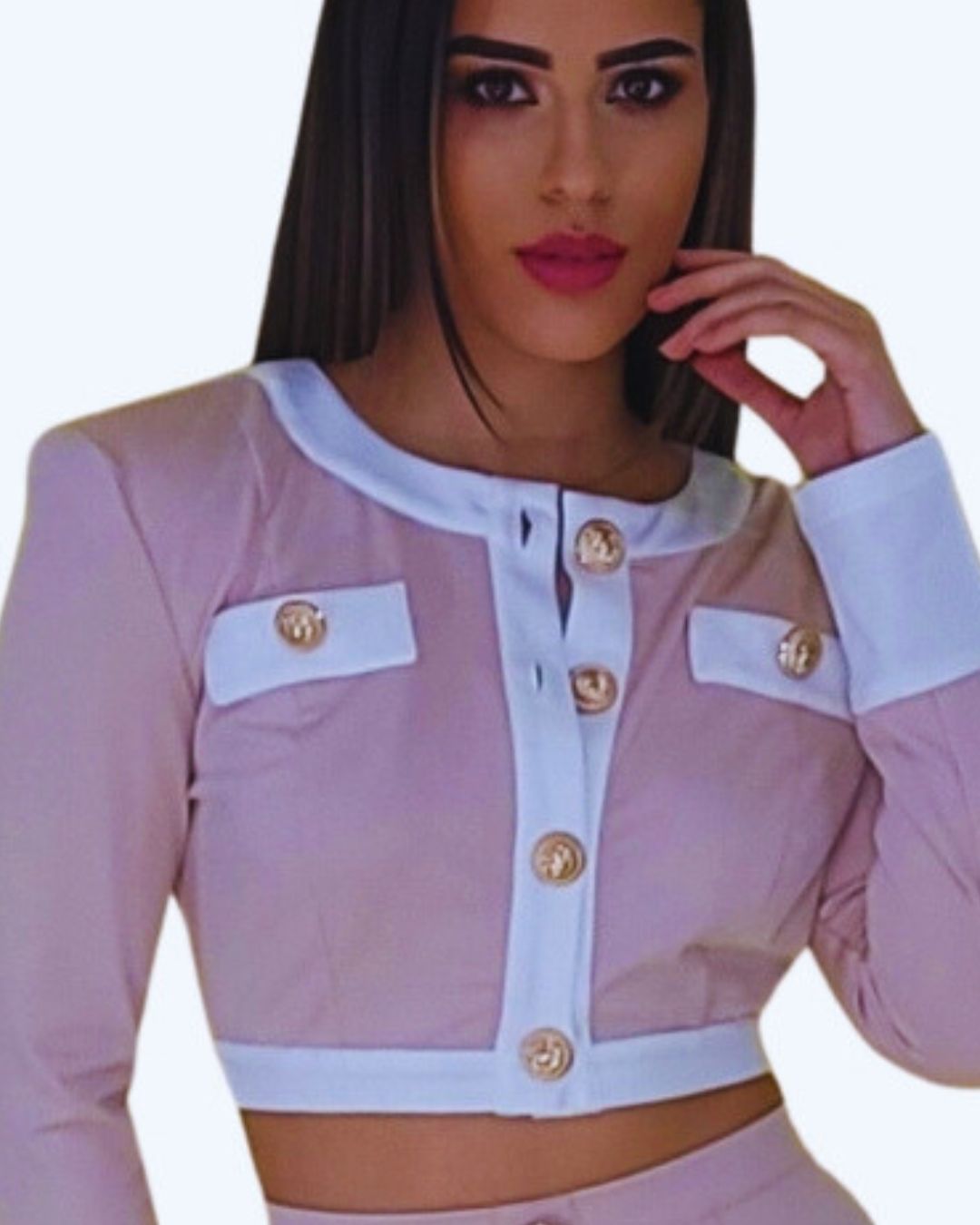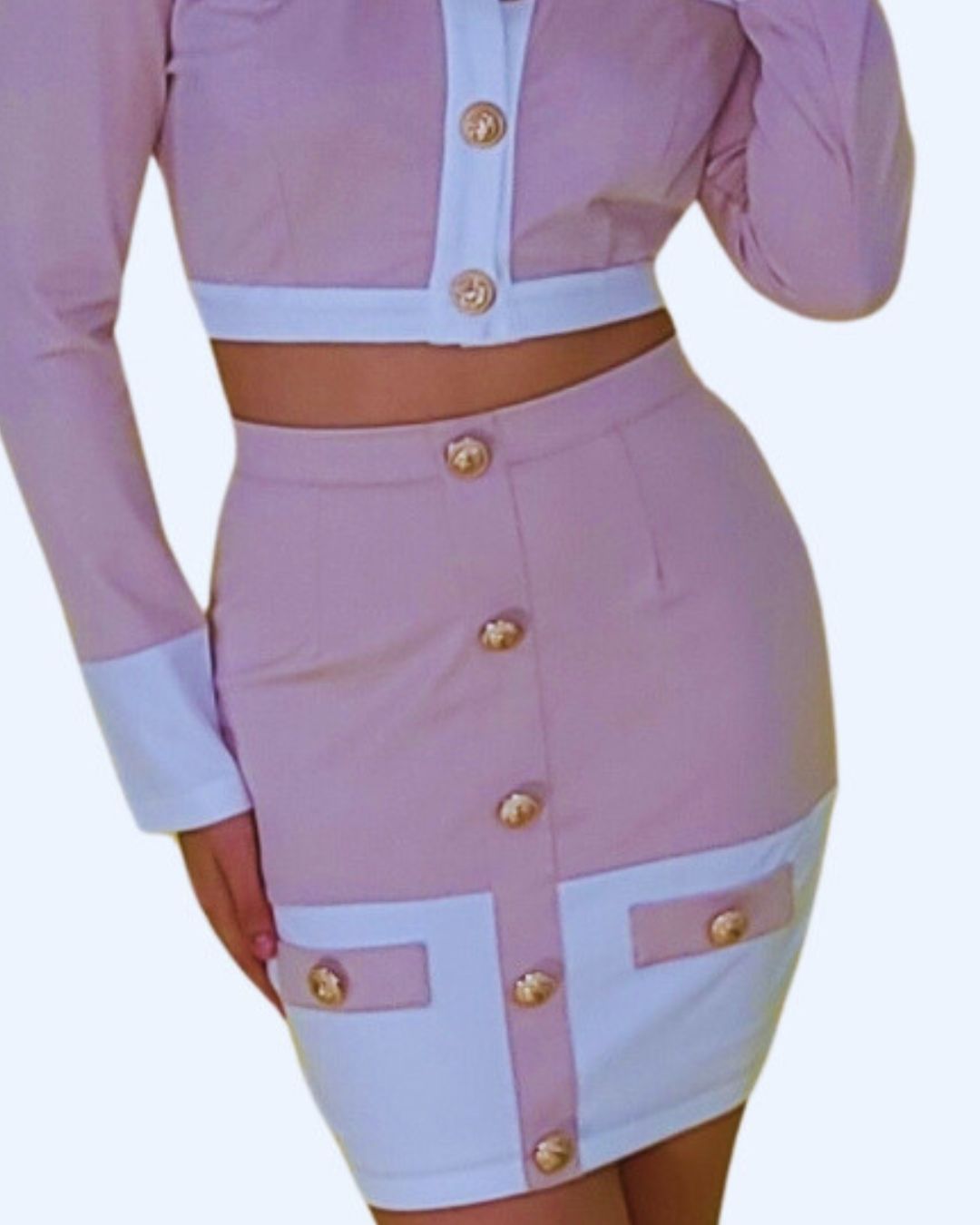 - Diseño: chaqueta corta + falda entallada, detalles de botones dorados